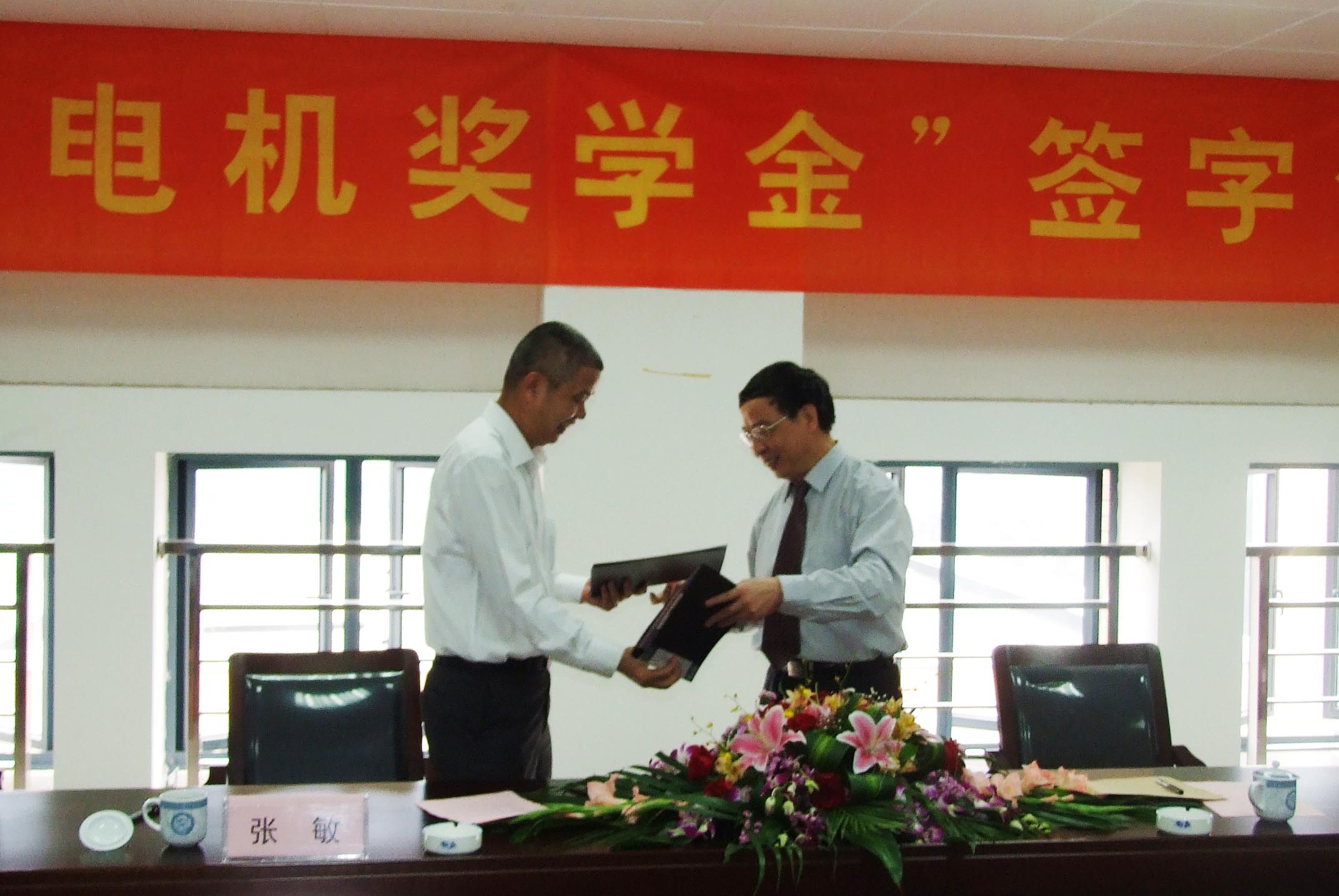 学院党委书记陈庆章和浙江方正电机股份有限公司董事长张敏先生交换“方正电机奖学金”协议书