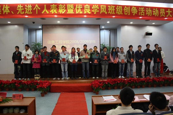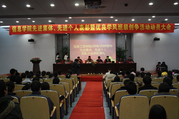 11月19日,学院在屏峰校区健B二楼报告厅召开2008/2009学年先进集体、先进个人表彰暨“优良学风班级创争”活动动员大会,学院党政班子成员、系主任、优秀班主任代表、校级优秀班级代表、2008/2009学年各类奖学金荣誉获得者、党支部书记、团学会成员、各班级班长、团支书、学习委员等近500人参加了会议。
