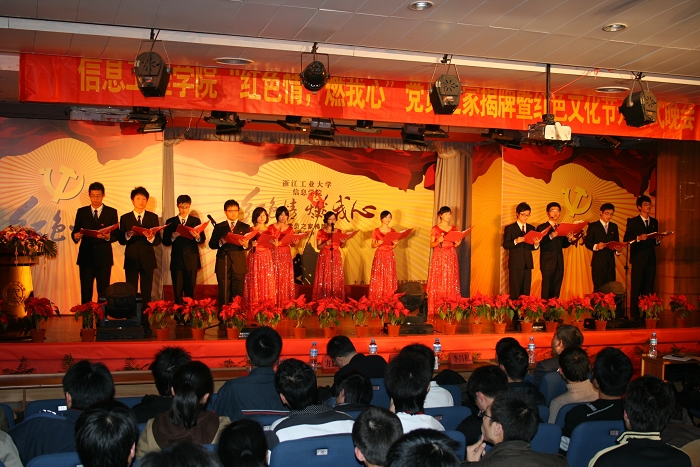 11月28日晚,信息学院在屏峰校区健行楼报告厅举办“红色情 燃我心” 红色文化节开幕式晚会暨党员之家揭牌仪式。浙江省新四军历史研究会合唱团团长蓝芳,校党委宣传部部长李昌祖、党委组织部副部长於建明、信息学院党委书记杨东勇、副院长方路平、副院长周晓、党委副书记王志军、党委委员杨马英、院长助理陈友良,各教工党支部书记和全体辅导员,全场共500余名师生党员一起观看了演出。
