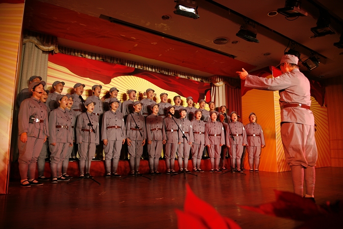 第二篇章——晚会表演用时120分钟,共演出了13个节目,以诗朗诵、大合唱、歌伴舞、音乐剧四种表演形式交替呈现。表演以党支部为单位,新四军历史研究会合唱团友情出演。学生党员们激情澎湃地演唱了《红旗下的颂歌》、《黄种人》、《走过六十年的记忆》、《红旗飘飘》、《我的中国心》,一首首耳熟能详的红歌引来了观众的强烈共鸣与阵阵掌声;配乐诗歌朗诵《我的祖国》、《长征组诗》声情并茂、震慑人心,赢得了一片又一片的喝彩声;音乐剧《红色恋人》主题鲜明、幽默诙谐,全场欢笑叠起;新四军合唱团的老艺术家们带来了《节日欢歌》、《北京颂歌》、《军歌联唱》、《在灿烂的阳光下》等精彩震撼的表演;团学会骨干演唱的《中国军魂》气势磅礴,表现出了新一代年轻人的朝气与热情;学院教工党支部表演的合唱《我们走在大路上》,激情洋溢、掌声如潮;最后,新四军合唱团表演的《爱我中华》将晚会推向高潮,台上台下观众齐声高歌,晚会现场红旗飘扬、鲜花舞动,晚会在欢乐、祥和、激情的氛围中完美谢幕。