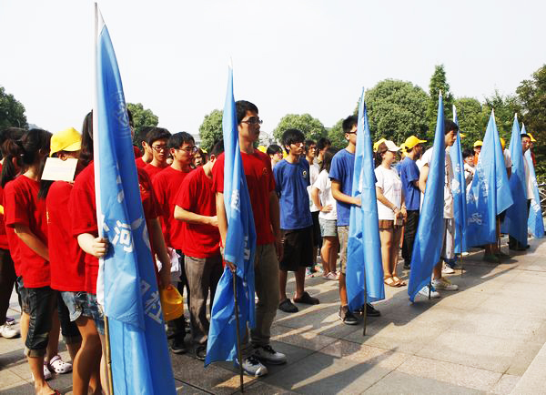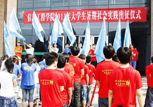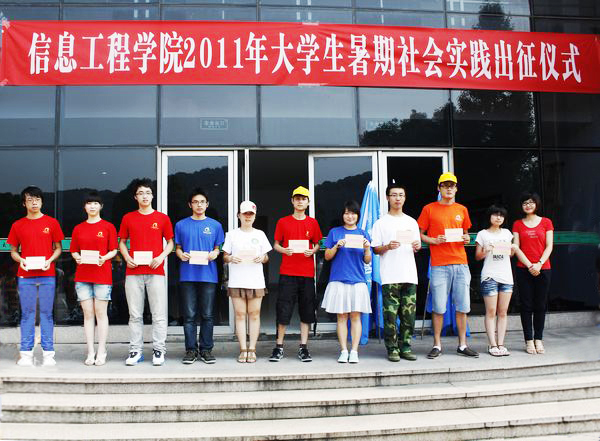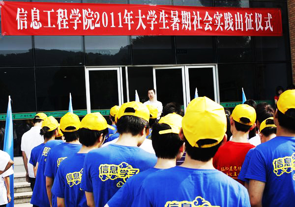 6月27日,信息工程学院2011年暑期社会实践出征仪式在广C楼前举行。学院党委副书记王志军、学院学工办副主任金诗南、分团委副书记仲国民、辅导员余昶及学院9支暑期社会实践重点团队成员共计100多人参加了出征仪式。