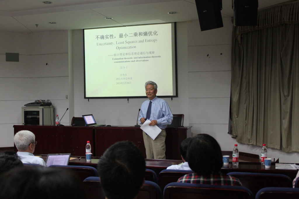 本次国际学术研讨会由李刚教授主持,李教授幽默的主持风格,为我们正式拉开了研讨会的序幕。首先由浙江大学信电系宫先仪院士从哲学的角度来剖析了关于“不确定性,最小二乘和熵优化”的问题,给我们传达了“自然尚奥”的理念,一种宏观看问题的思想。宫院士强调“不确实性不可能完全被消除,一个世界,如果绝对无不确实性,那人们生活其间一定单调、滞呆,而无乐趣”。信号处理的知识不仅仅对当今科学界至关重要,对我们为人处世更有着指导作用,遵循“人事求简”的自然法则。接下来作报告来自新加坡南洋理工大学的Lim Yong Ching教授,Lim教授用风趣而形象生动的语言为我们介绍了“等波纹FIR和IIR数字滤波器设计中的加权最小二乘技术”,让同学们在笑声中轻松掌握了知识。来自浙大的王智教授跟我们分享了DOA估计中的稀疏信号表示及子带信息融合。下午,首先由来自新加坡南洋理工的Bi Guoan教授给我们讲述了LV分布的性能及应用。接着是来自杭电的周绍生教授向我们介绍了自旋-1/2量子系统中的坐标变换和渐近跟踪,周老师治学的严谨给我们留下了深刻的印象。最后,来自浙工大理学院的邸继征教授带领我们走进小波分析的殿堂,一起领略了小波分析的独特风采。会后同学们向专家们提出了自己的疑问,每位专家都耐心解答了同学的问题。