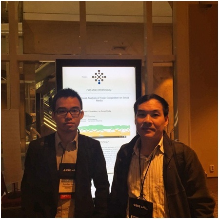 两篇论文均为口头报告(Oral Paper),第一篇论文(EvoRiver: Visual Analysis of Topic Coopetition on Social Media,第一作者为梁荣华的博士生孙国道)为TVCG Track,该论文提出了一种基于时间的可视分析新方法,对社交媒体大数据的主题之间合作关系进行建模和分析,该论文在顶级期刊IEEE Transactions on Visualization and Computer Graphics (20(12):1753 - 1762)发表,第二篇论文(A Visual Reasoning Approach for Data-driven Transport Assessment on Urban Roads)为Conference-only Track,该论文与浙江大学合作发表,提出了一种基于出租车GPS大数据的城市道路规划的可视分析方法。