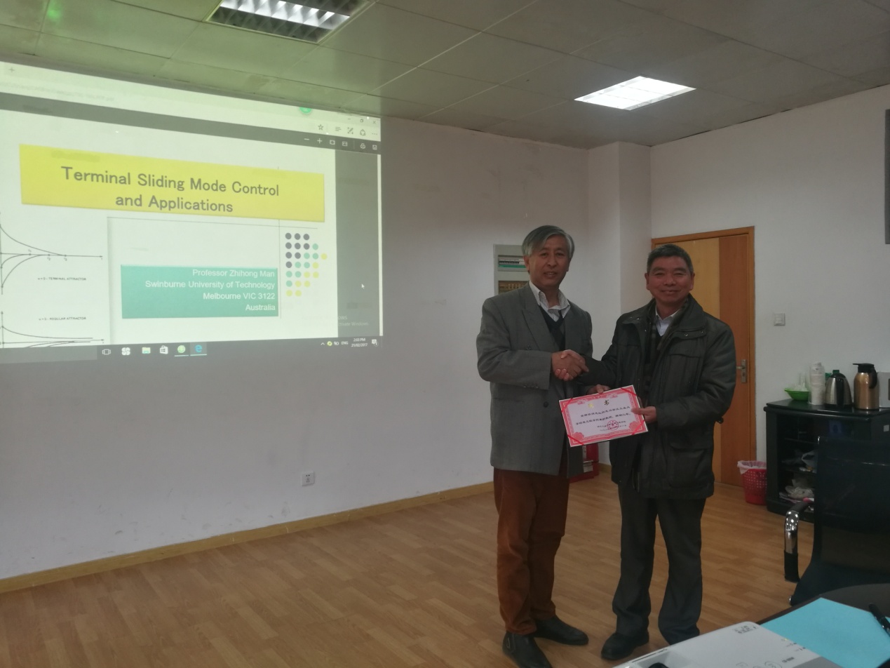 2017年2月21日下午,澳洲SWINBURNE科技大学满志红教授,中科院沈阳自动化所义乌研究中心主任张毅研究员,来到我院与广大师生进行学术与项目交流。学院杨东勇书记为2位专家颁发了信息工程学院兼职教授聘书。 两位专家就滑模控制理论与应用、工业机器人发展现状、联合陪养研究生、国际化双学位项目、共同申报省重大研发计划等方面与我院师生进行了深入交流。两满志红教授连结合自己的经验就如何撰写优质的英语论文与在座的研究生展开了讨论,并耐心仔细地解答了大家的提问。报告会现场气氛热烈,参会师生受益颇多。