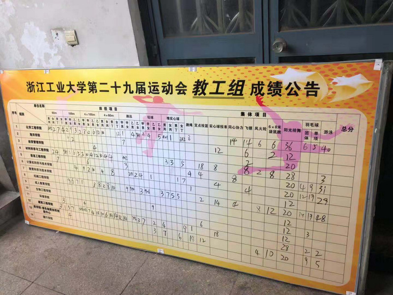11月1日至3日,校第二十九届运动会在屏峰校区运动场举行,我院教师在运动场上奋力拼搏,在游泳、羽毛球、团体操、同心协力、田径等项目上进入前八,最终我院教师组共获得95分。 为积极参与校运动会,学院工会召开了工会委员和小组长会议,积极筹划各项目的组织,大家集思广益,做好项目的宣传发动、报名和组织工作,工会还安排了委员和小组长进行大本营的值班值日工作,做好教师运动员的后勤工作。 以下是取得前八的项目和教师名单,再次祝贺并感谢各位老师的积极参与!
