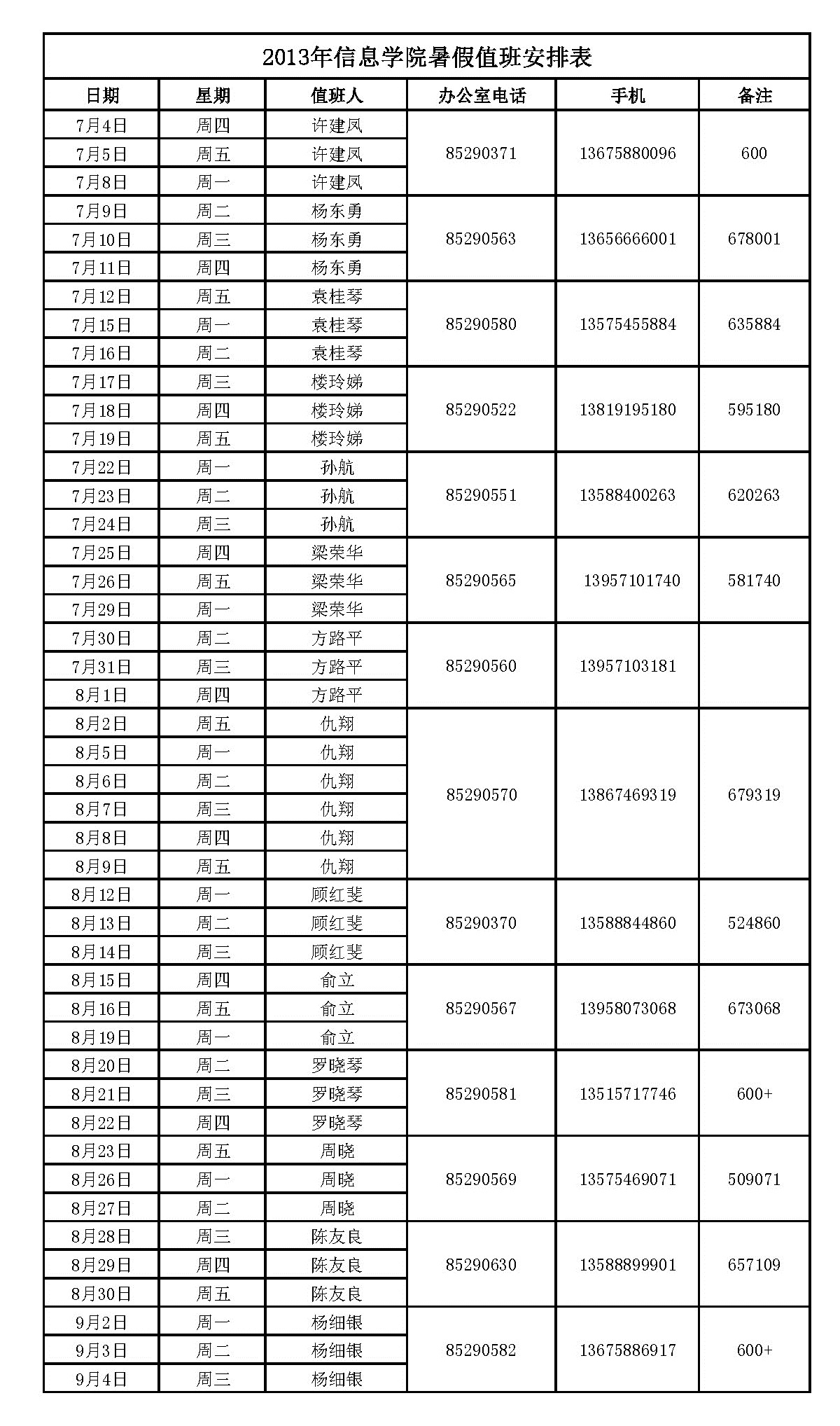 2013年信息学院暑假值班安排表
