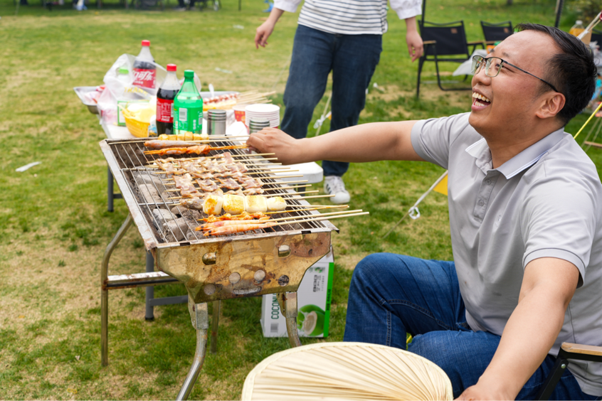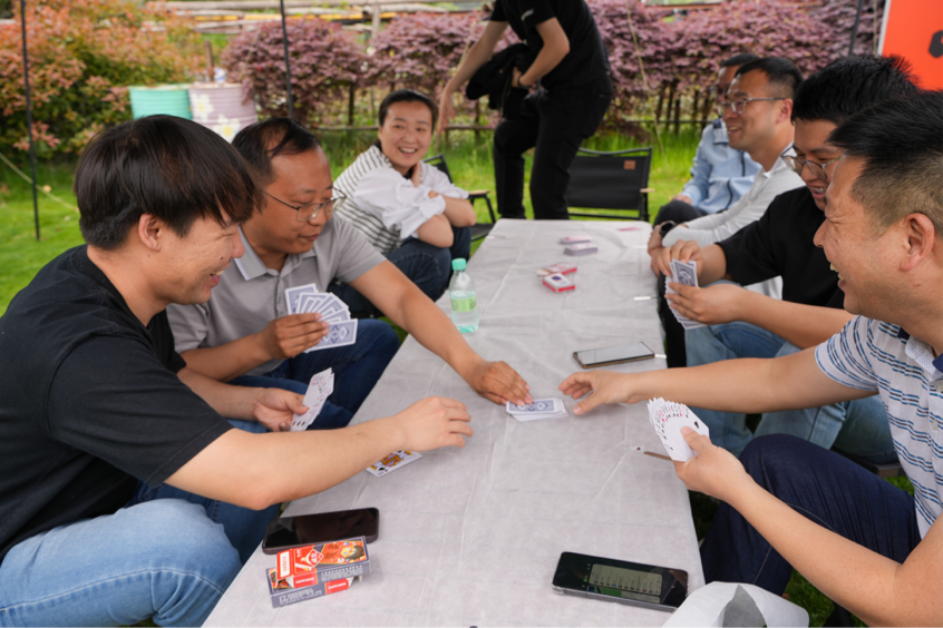 在营地,老师们,支起烤架,生起炭火,一起享用美味的烧烤盛宴,在炭火炙烤间共度美好时光。 用餐后,大家步入云雾缭绕的生态茶园,沿着霞光步道缓缓前行。春日的山林仿佛被打翻的调色盘,嫩绿的茶叶,星星点点的野花,偶尔掠过的鸟影,每一步走过都是靓丽的景色。在潺潺溪畔的天幕雅座间,大家一同体验围炉煮茶的东方美学。露营地配备古风茶具与茶点,老师们或执牌对弈,或静听风吟,享受诗意时光,现场弥漫着悠闲的气息。